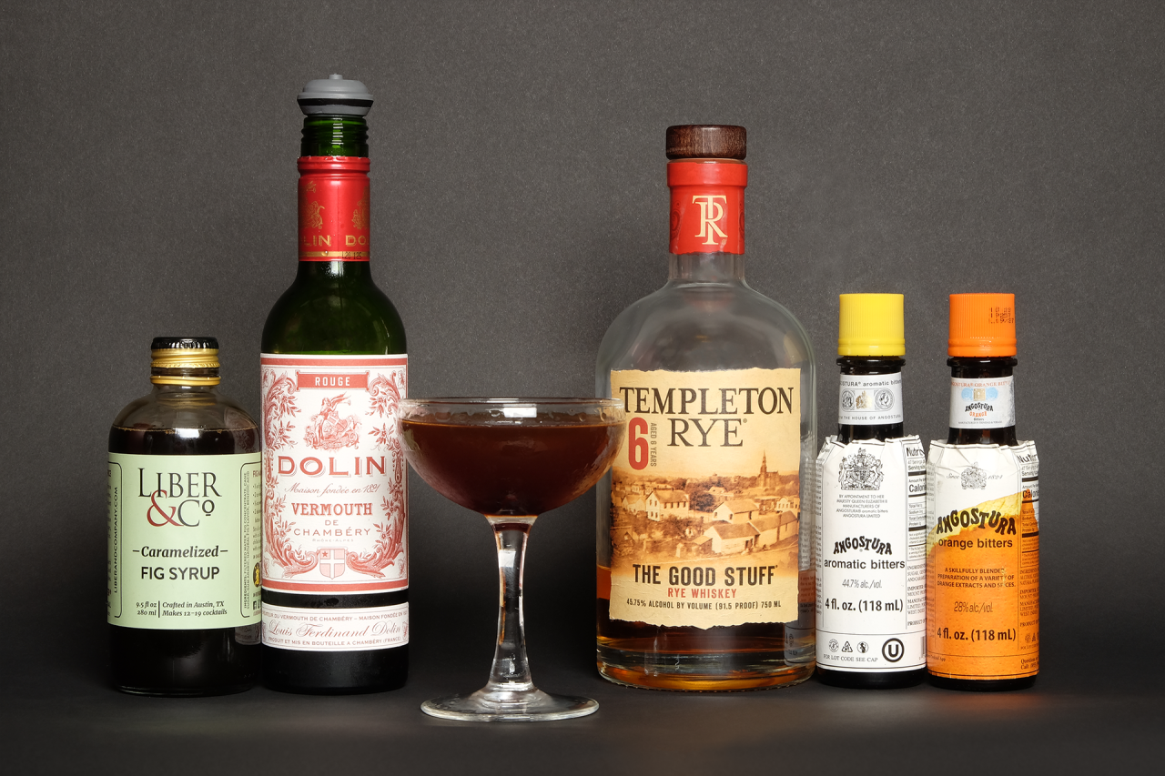 This drink uses a specific product: a caramelized fig syrup made from California black mission and calimyrna figs. The caramelization brings out decadent burnt caramel flavors that complement barrel-aged spirits like whiskey and rum.