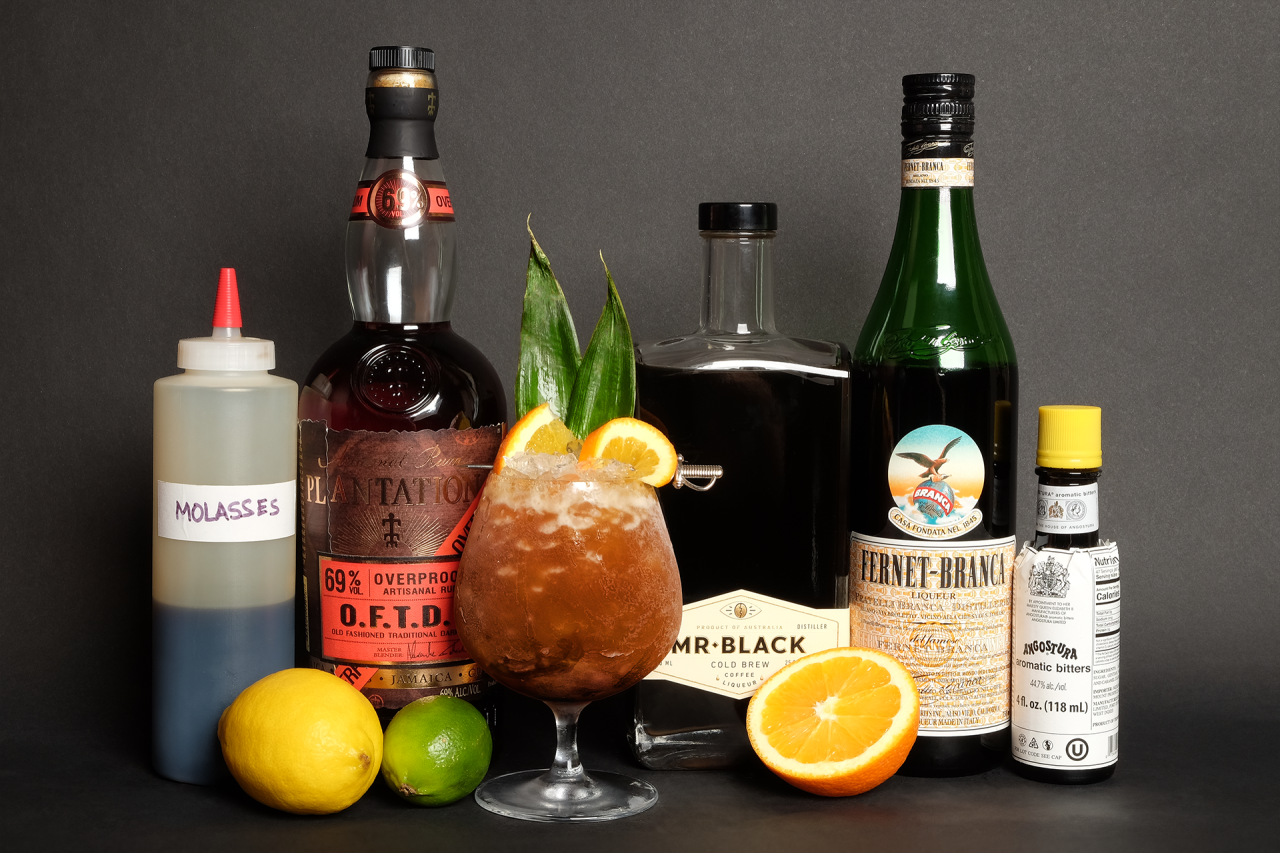 The interplay between the molasses, fruit juices, bitter coffee and herbaceous Fernet creates a deeply layered flavor profile.